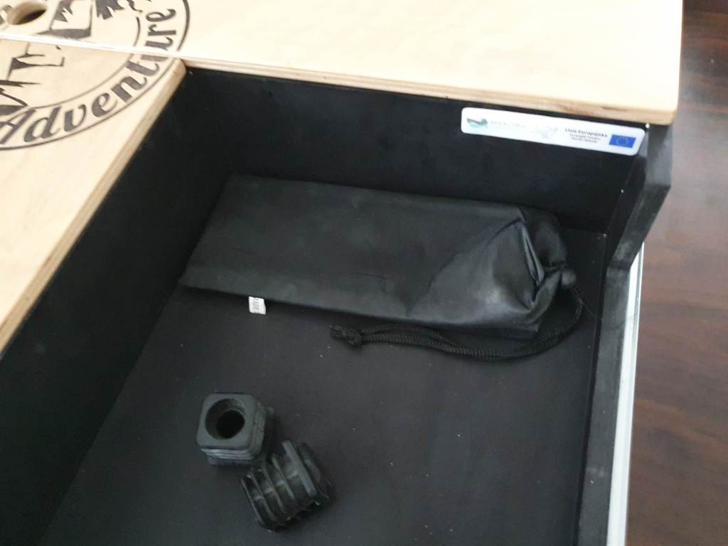 - moduł kuchni – kuchenka gazowa z wymiennymi kartuszami pozwoli na przygotowanie prostych posiłków – porannej kawy i śniadania czy szybkiego posiłku na postoju w trasie. W boxie kempingowym znajdziemy również zbiorniki na czystą wodę z kranem z regulacją strumienia oraz blat na szufladowy do przygotowania posiłków.
