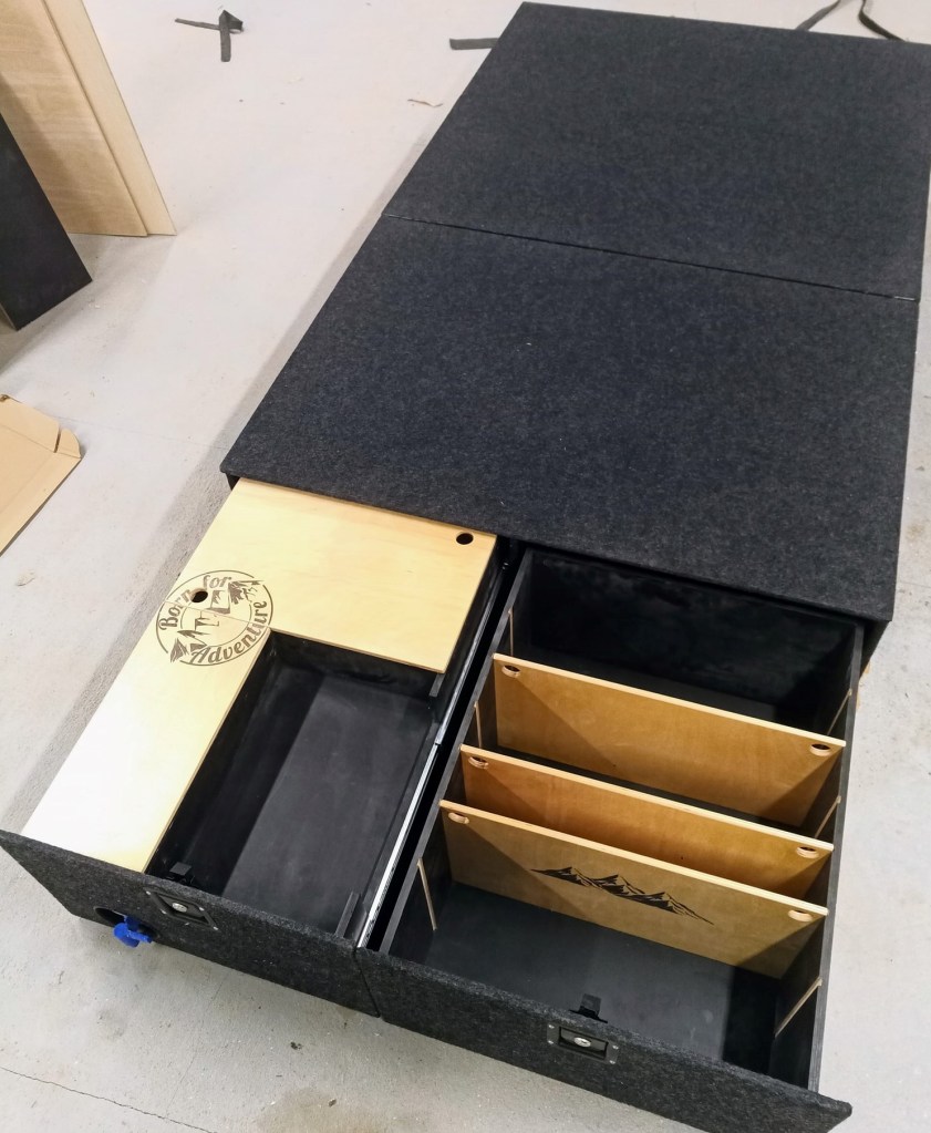 Skrzynia mocowana pasami do 4 fabrycznych uchwytów w podłodze bagażnika. Dzięki temu w szybki sposób z naszego kombivan tworzymy samochód na krótkie wyprawy. Skrzynia wyposażona łóżko, kuchenkę, lodówkę i zbiorniki na wodę.